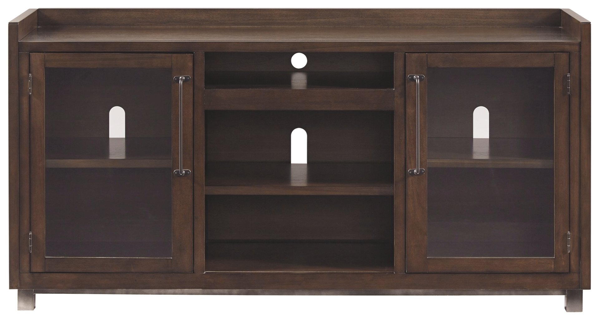 - 2 glass-front cabinets, each with an adjustable shelf; adjustable/removable center shelf, open cubby and cutouts for wire management